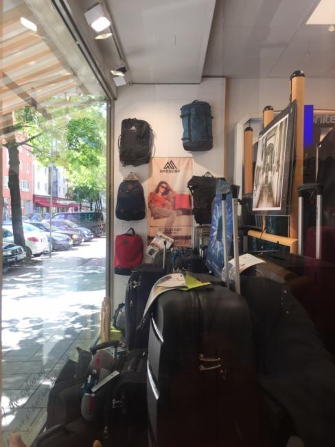 Ferner der Gregory Schaukasten mit dem Deuter befüllt mit neuem Lichtlogo / Videobeiträge für Bilderrahmen und Gregory im Kofferfenster bei Samsonite unter gebracht an der früheren Deuter Wand. Mit Videobeiträgen in Bilderrahmen werden die Themen verstärken. Die Restaurierung der Kassentheke und Kleinlederwaren die verkleinert wurden schaffen zusätzlichen Raum und die Schaufenster wurden neu bezogen. Die Eröffnungsdeko bestand aus den selbstgeschnitzten Büscher Unikaten von Manuel und Peter Büscher.