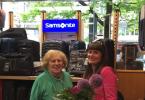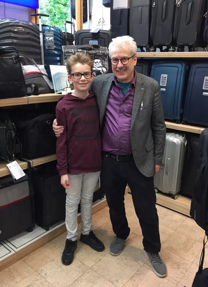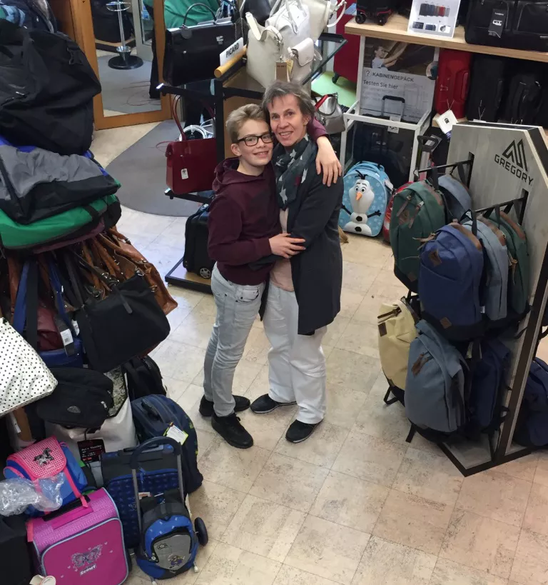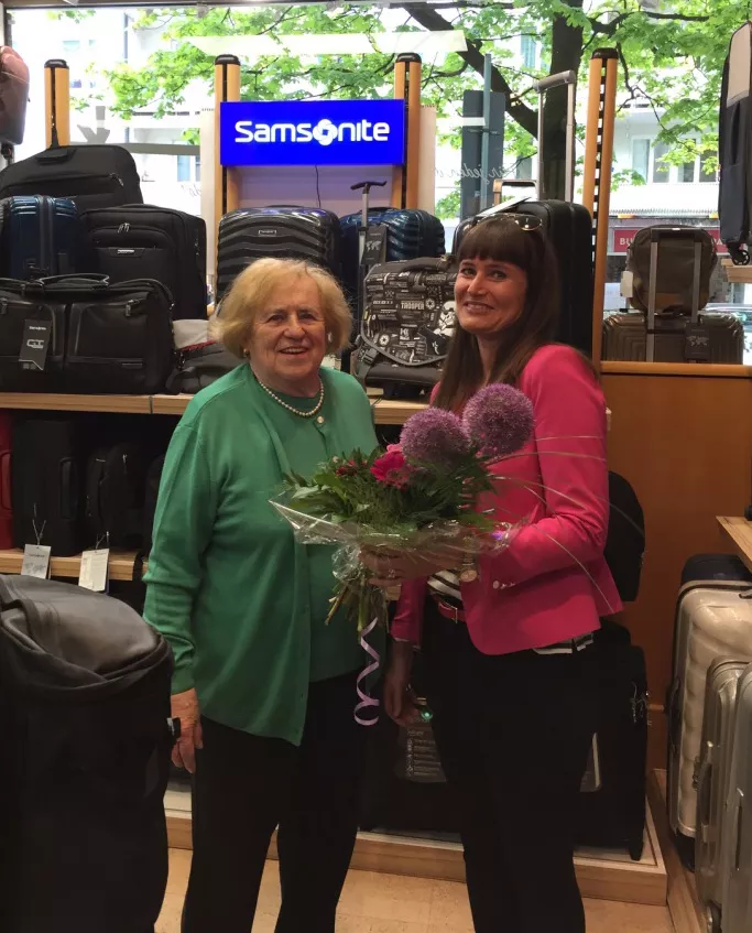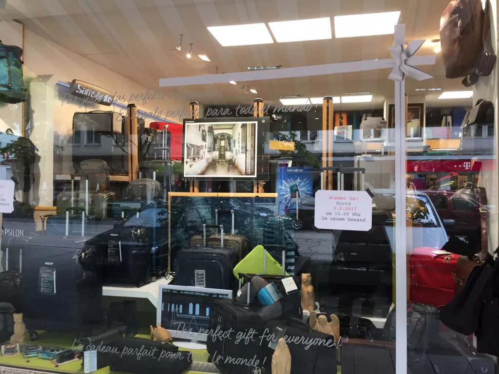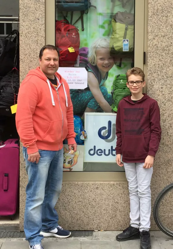 Wir sind seit 5.5.2017 wieder für Sie da. Besuchen Sie uns und erfreuen Sie sich an der Umgestaltung. In Bild die Repräsentanten der Firma Deuter und der Firma Samsonite, Frau Meike Sparrenberg und Herr Matthias Herr. Die ersten Gratulanten bekamen ein handgeschnitztes Häuschen von Herrn Büscher.