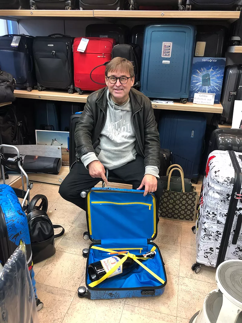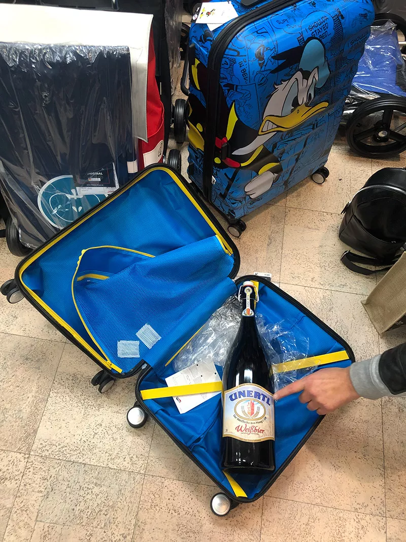 Unser Stammkunde Stefan Riebel suchte für seine Sylvester 3 Liter Magnum Flasche Unertl ein Transportmittel. Unser Koffer- und Bierspezialist wurde fündig: "American Tourister Donald Duck" beschützt jetzt die Magnum Flasche bis zum Verzehr.
